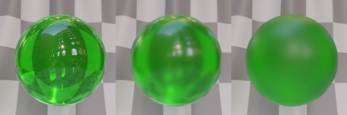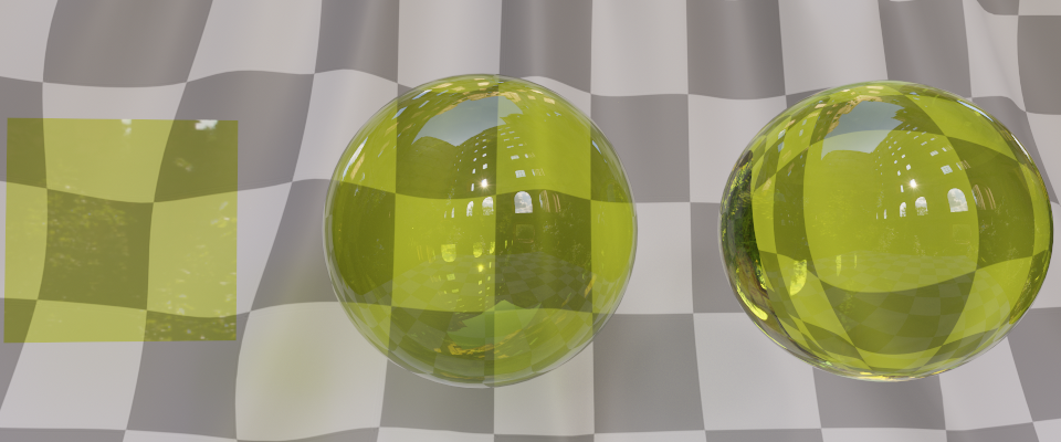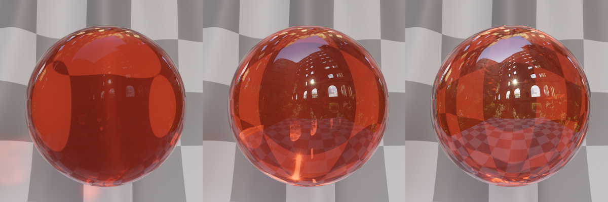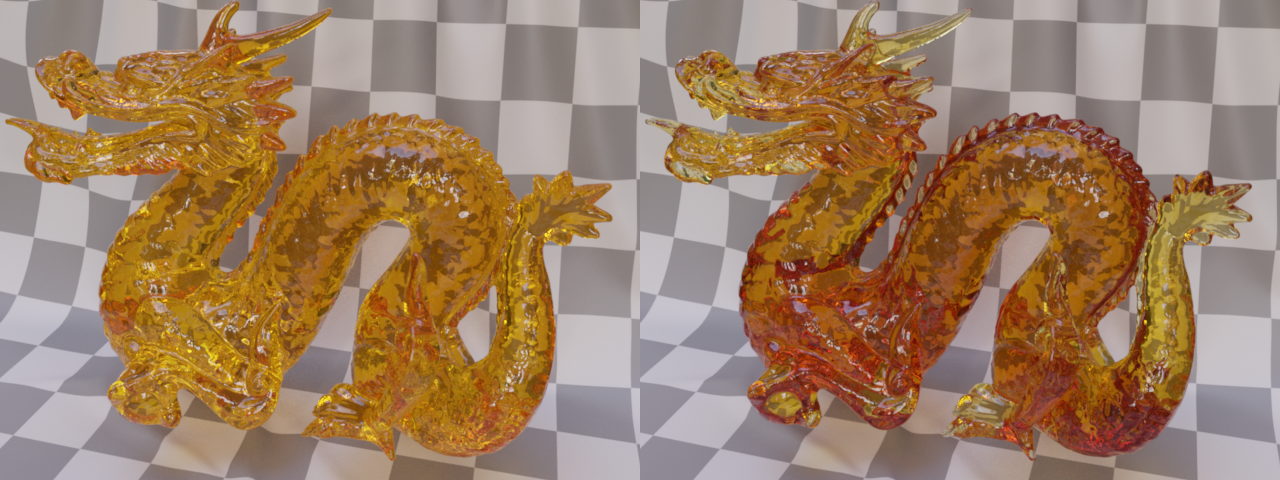 A light ray being refracted in a volume. The volume is homogeneous and has an index of refraction of 1.5. At the boundaries, the direction of the light ray is bent according to the indices of refraction at incident and outgoing side. Inside the volume, light is attenuated as it travels through the medium into the direction of the eye. The longer it travels, the more it is attenuated. The index of refraction is taken from `KHR_materials_ior`</figcaption> </figure> If the extension is combined with `KHR_materials_transmission`, a refractive microfacet BTDF describes the transmission of light through the volume boundary. The refraction occurs on microfacets, and thus the roughness parameter affects both reflection and transmission. An exemplatory implementation is shown in [Implementation](#Implementation). Transmissive sphere with varying roughness. From left to right: 0.0, 0.2, 0.4. ## Extending Materials The volumetric properties are defined by adding the `KHR_materials_volume` extension to any glTF material. A non-zero thickness switches from thin-walled to volumetric behavior. This requires a manifold/closed mesh. The properties of the medium are not texturable, it is assumed to be homogeneous. ```json "materials": [ { "extensions": { "KHR_materials_volume": { "thicknessFactor": 1.0, "attenuationDistance": 0.006, "attenuationColor": [ 0.5, 0.5, 0.5 ] } } } ] ``` ## Properties The extension defines the following parameters to describe the volume. | | Type | Description | Required | |-|------|-------------|----------| | **thicknessFactor** | `number` | The thickness of the volume beneath the surface. The value is given in the coordinate space of the mesh. If the value is 0 the material is thin-walled. Otherwise the material is a volume boundary. The `doubleSided` property has no effect on volume boundaries. Range is \[0, +inf). | No, default: `0`. | | **thicknessTexture** | `textureInfo` | A texture that defines the thickness, stored in the G channel. This will be multiplied by `thicknessFactor`. Range is \[0, 1]. | No | | **attenuationDistance** | `number` | Density of the medium given as the average distance that light travels in the medium before interacting with a particle. The value is given in world space. Range is (0, +inf). | No, default: +Infinity | | **attenuationColor** | `number[3]` | The color that white light turns into due to absorption when reaching the attenuation distance. | No, default: `[1, 1, 1]` | ## Thickness Texture The thickness of a volume enclosed by the mesh is typically quite difficult to compute at run-time in a rasterizer. Since glTF is primarily used with real-time rasterizers, this extension allows for the thickness of the volume to be baked into a thickness map. Thickness is given in the coordinate space of the mesh. Any transformations applied to the mesh's node will also be applied to the thickness. Thickness is an absolute value and defined as the product of thickness factor and thickness texture value. The thickness factor is defined in the range \[0, +inf), whereas the thickness texture value range is limited to \[0, 1]. An exemplary configuration could set the thickness factor to the longest edge of the bounding box of a mesh, and the texture scales this value so that it corresponds to the actual thickness underneath each surface point. Baking thickness into a map is similar to ambient occlusion baking, but rays are cast into the opposite direction of the surface normal. Dark values represent thin parts, bright values represent thick parts of the model. Computing volumetric effects with a thickness map is a lossy process. We use the thickness map to estimate the distance that a light ray will travel until it exists the volume. The estimation takes place at the entrance point, where we fetch the thickness from the thickness map. The actual distance, however, varies with the angle of incidence at the entrance point, as this angle determines the direction into which the light ray will travel through the mesh. Ray-tracers should ignore the thickness texture and use the actual, ray-traced distance instead. For this reason it is important that thickness factor and texture represent the actual thickness as accurate as possible. An accurate representation ensures that visual results look consistent across different rendering techniques. Note that it is still necessary to check the `thicknessFactor` to determine whether the object is thin-walled or volumetric. ## Refraction Light rays falling through the volume boundary are refracted according to the index of refraction (IOR) given in `KHR_materials_ior`. The IOR determines the refraction angle. If `KHR_materials_ior` is not available, the IOR is 1.5. Transmissive sphere with varying index of refraction. From left to right: 1.1, 1.5, 1.9. ## Attenuation The way in which a volumetric medium interacts with light and, therefore, determines its appearance is commonly specified by the attenuation coefficient σt (also know as *extinction* coefficient). It is the probability density that light interacts with a particle per unit distance traveled in the medium. σt is a wavelength-dependent value. It's defined in the range [0, +inf) with m-1 as unit. There are two types of interaction between light photons and particles: absorption and scattering. Absorption removes the light energy from the photon and translates it to other forms of energy, e.g., heat. Scattering preserves the energy, but changes the direction of the light. Both act in wavelength-dependent manner. Based on these two possibilities, the attenuation coefficient is defined as the sum of two other coefficients: the absorption coefficient σa and the scattering coefficient σs. σt = σa + σs > **NOTE** > > This extension does not define the scattering part of the volumetric light transport. For all further definitions we assume the scattering coefficient σs to be zero for all wavelength, and therefore σt = σa. The infinite range of the coefficient